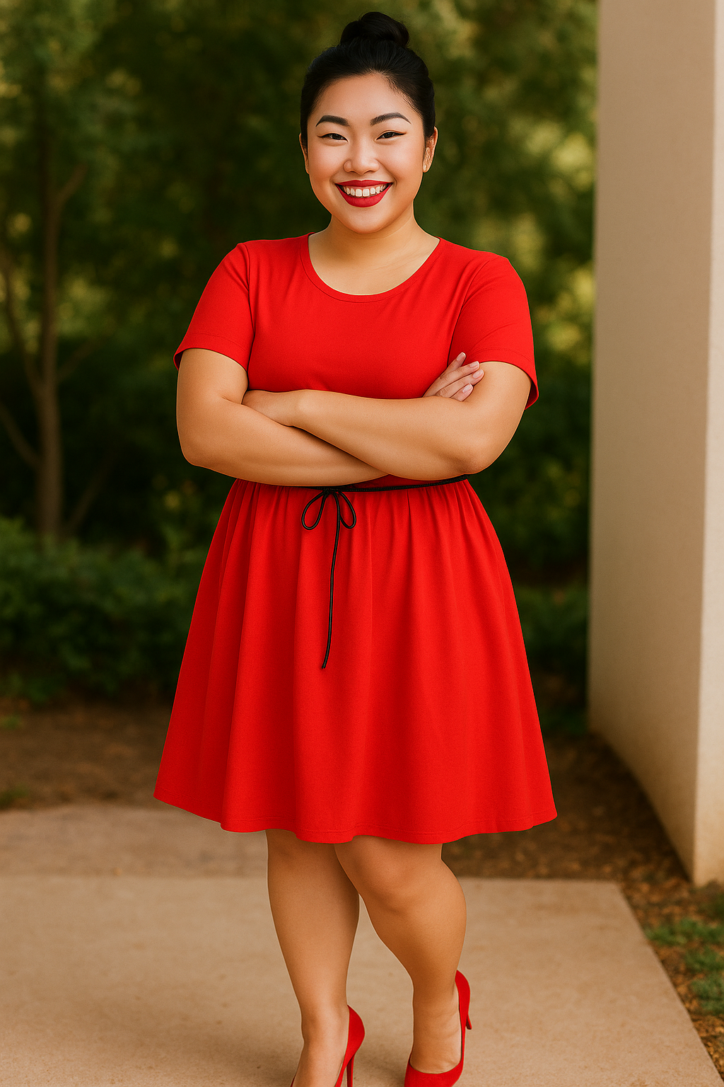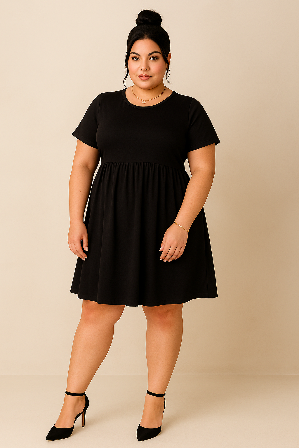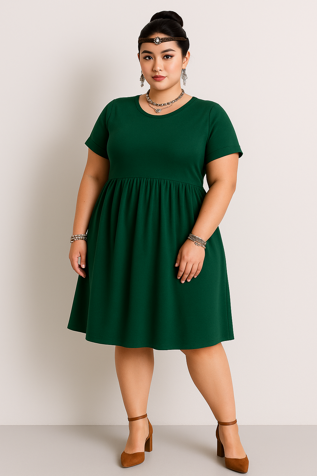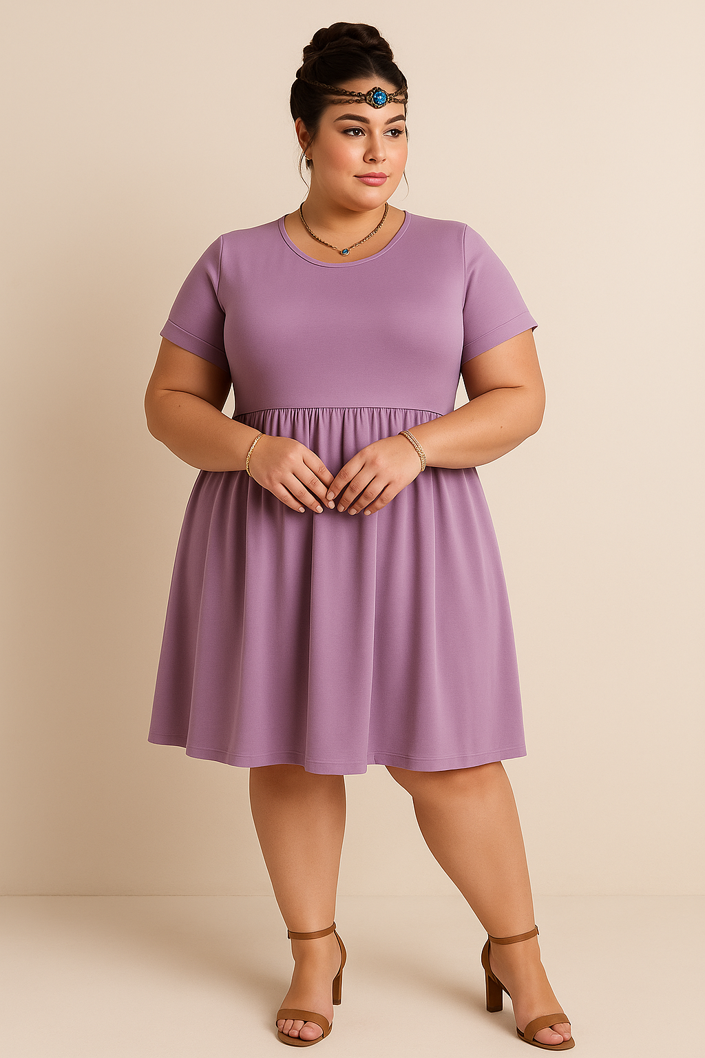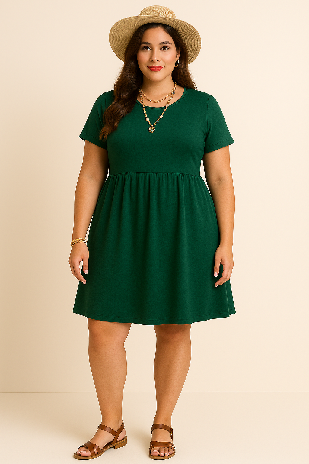 Son tissu uni se marie facilement avec vos accessoires préférés et sa longueur juste au-dessus du genou lui donne un charme intemporel. Une encolure ronde et des manches courtes apportent la touche finale à ce modèle confortable et féminin.