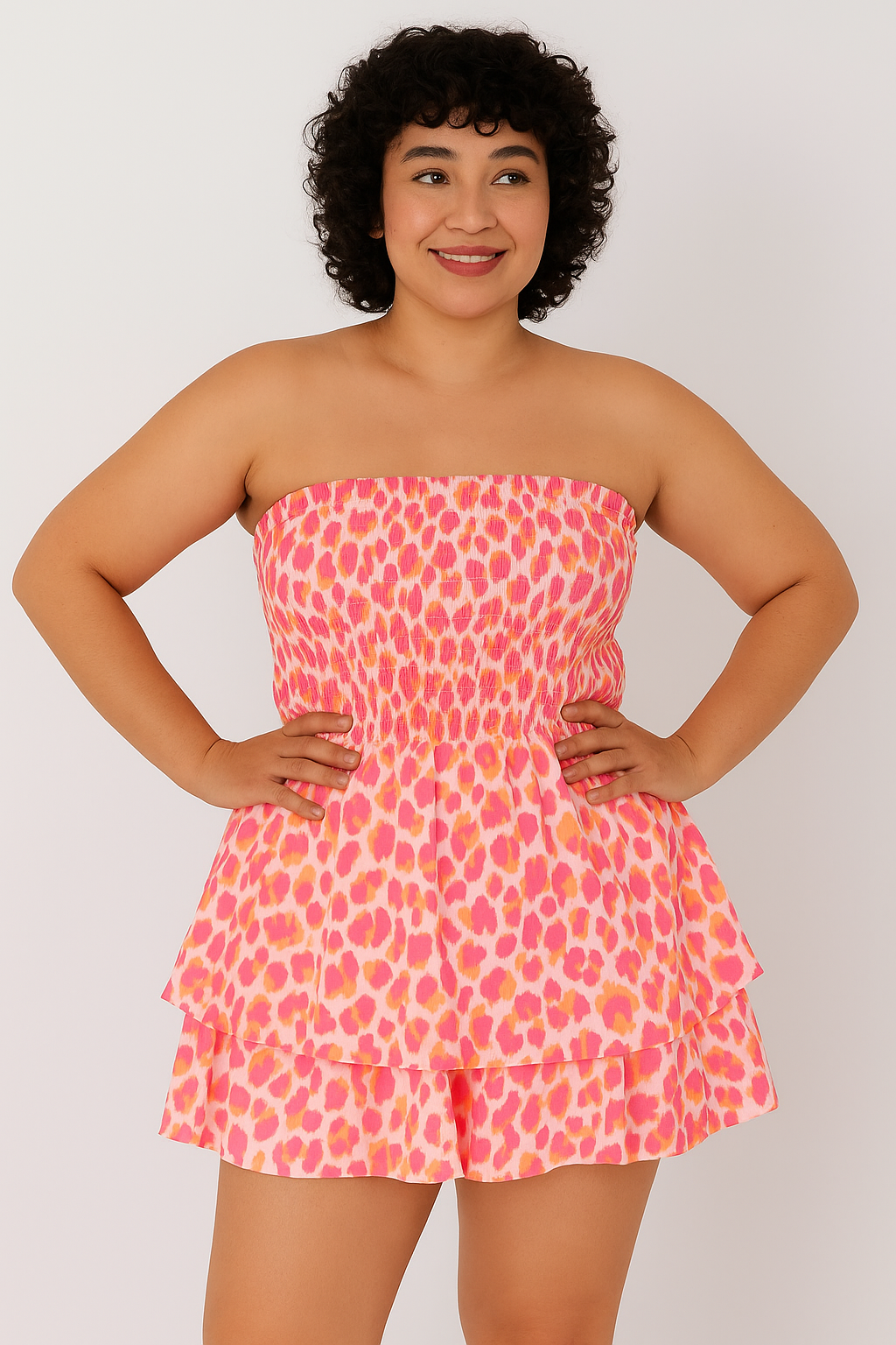Avec ses jambes courtes, sa coupe sans manches et son décolleté droit, elle est parfaite pour l’été. Son motif discret souligne la sobriété de la tenue, tandis que les fronces et les volants ajoutent une touche de féminité. L'absence de fermeture garantit une grande facilité d’enfilage et de confort.