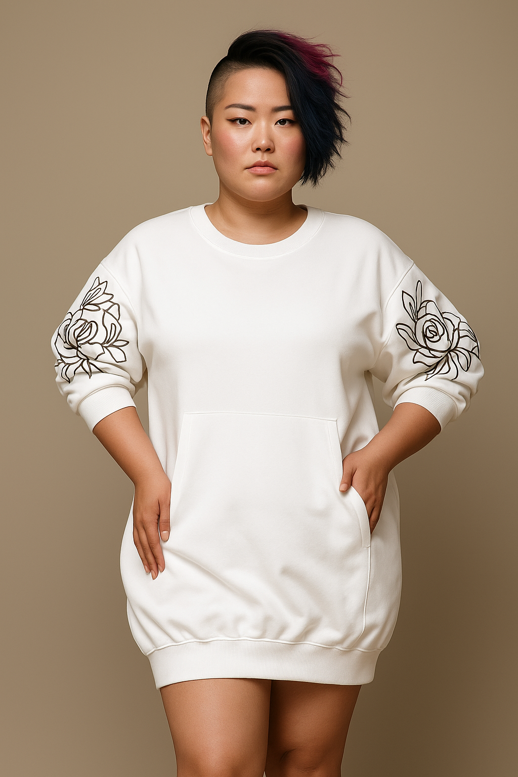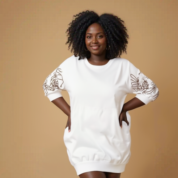 Les manches 3/4 subtilement brodées apportent une touche chic sans effort, tandis que la poche kangourou sur le devant donne du caractère à l’ensemble et une praticité bienvenue.